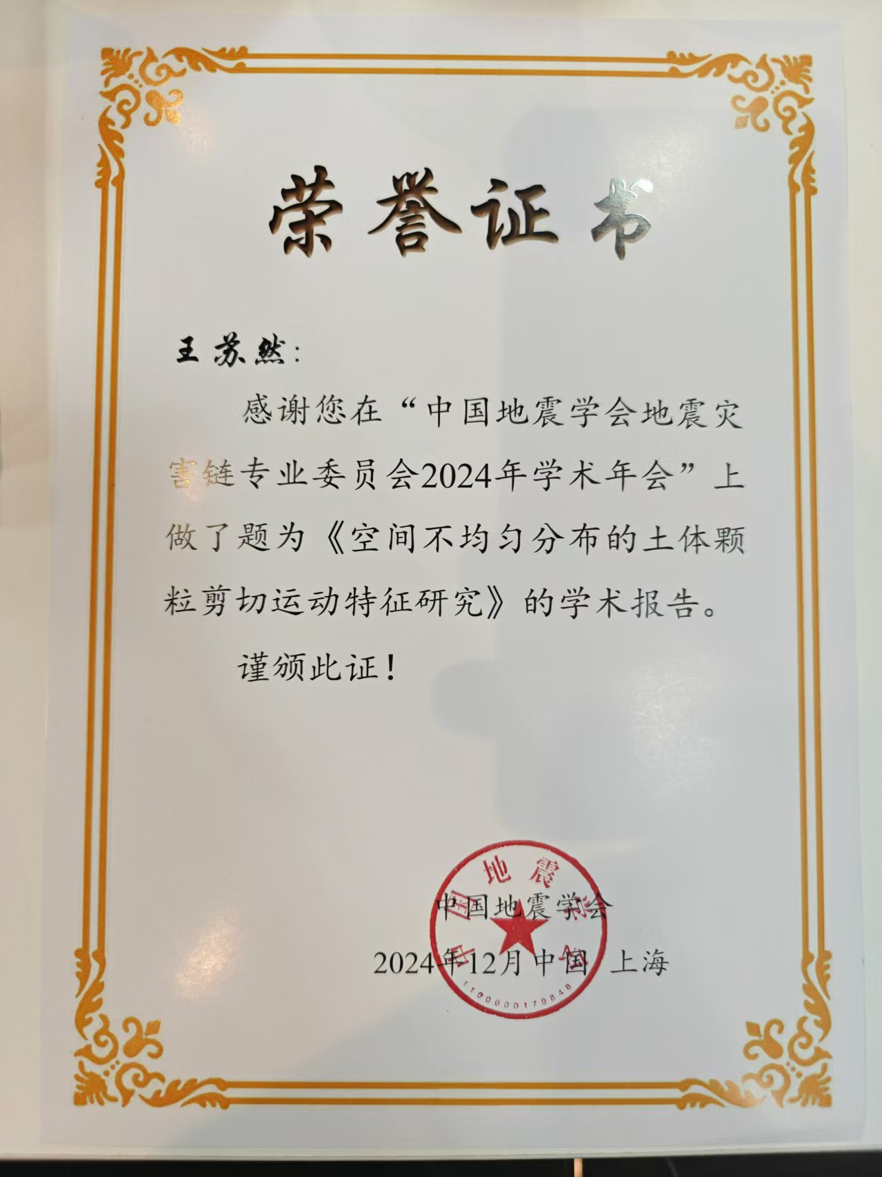 团队负责人参加“中国地震学会地震灾害链专业委员会2024年学术年会”并作题为《空间不均匀分布的土体颗粒剪切运动特征研究》报告,并与团队合影。