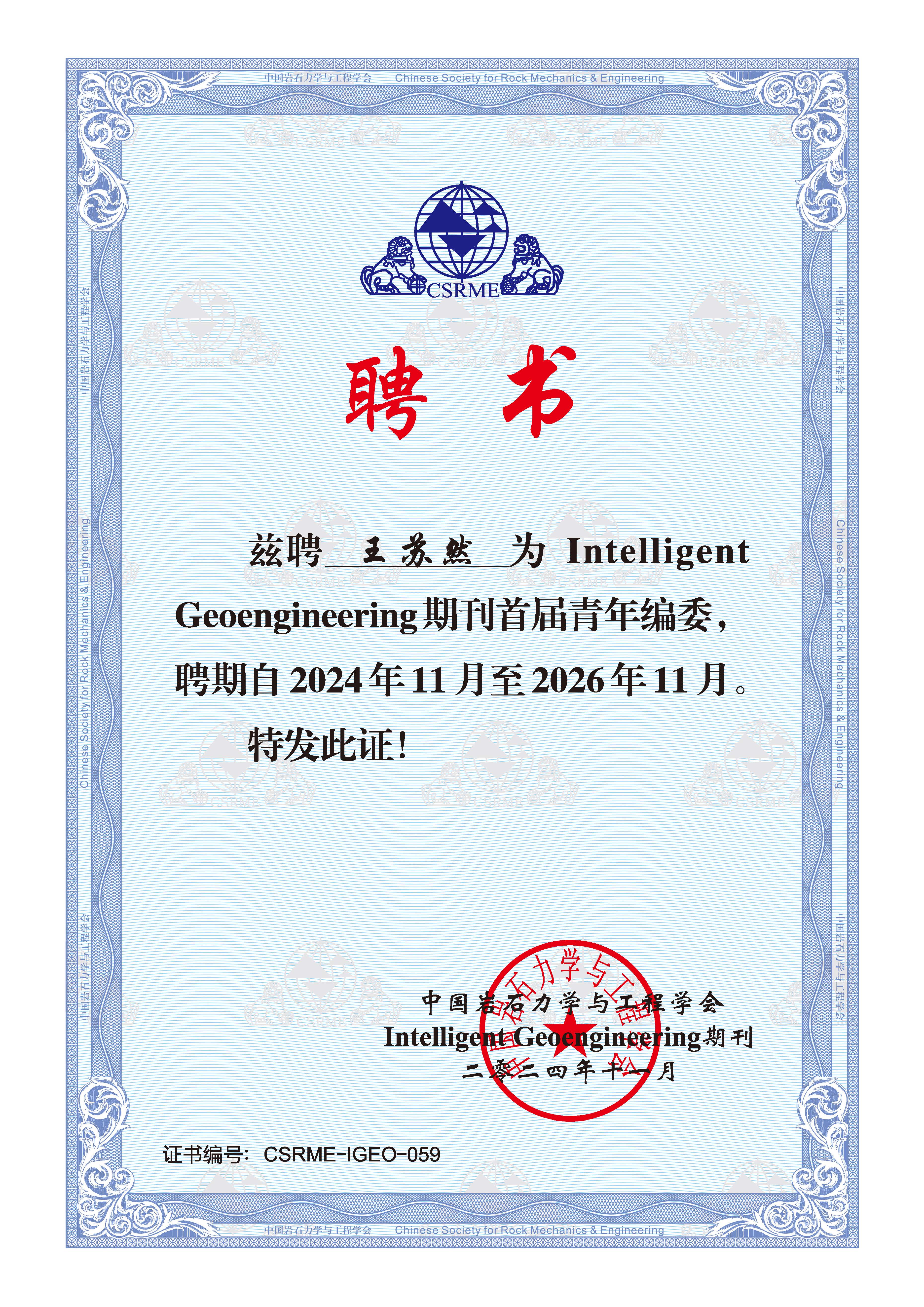 团队负责人王苏然博士受聘成为国际期刊Intelligent Geoengineering期刊首届青年编委,为期两年。Intelligent Geoengineering是期刊是中国岩石力学与工程学会主办的第二本国际英文期刊,由学会理事长何满潮院士、河北工业大学马国伟教授和陈光齐教授、美国加利福尼亚大学伯克利分校的Steven Glaser教授共同担任主编。期刊旨在构建一个全球学术平台,促进人工智能、大数据等新技术在岩石力学与工程中的应用,推动创新解决方案,鼓励跨学科合作,提升全球影响力,推动岩土工程的智能化发展。