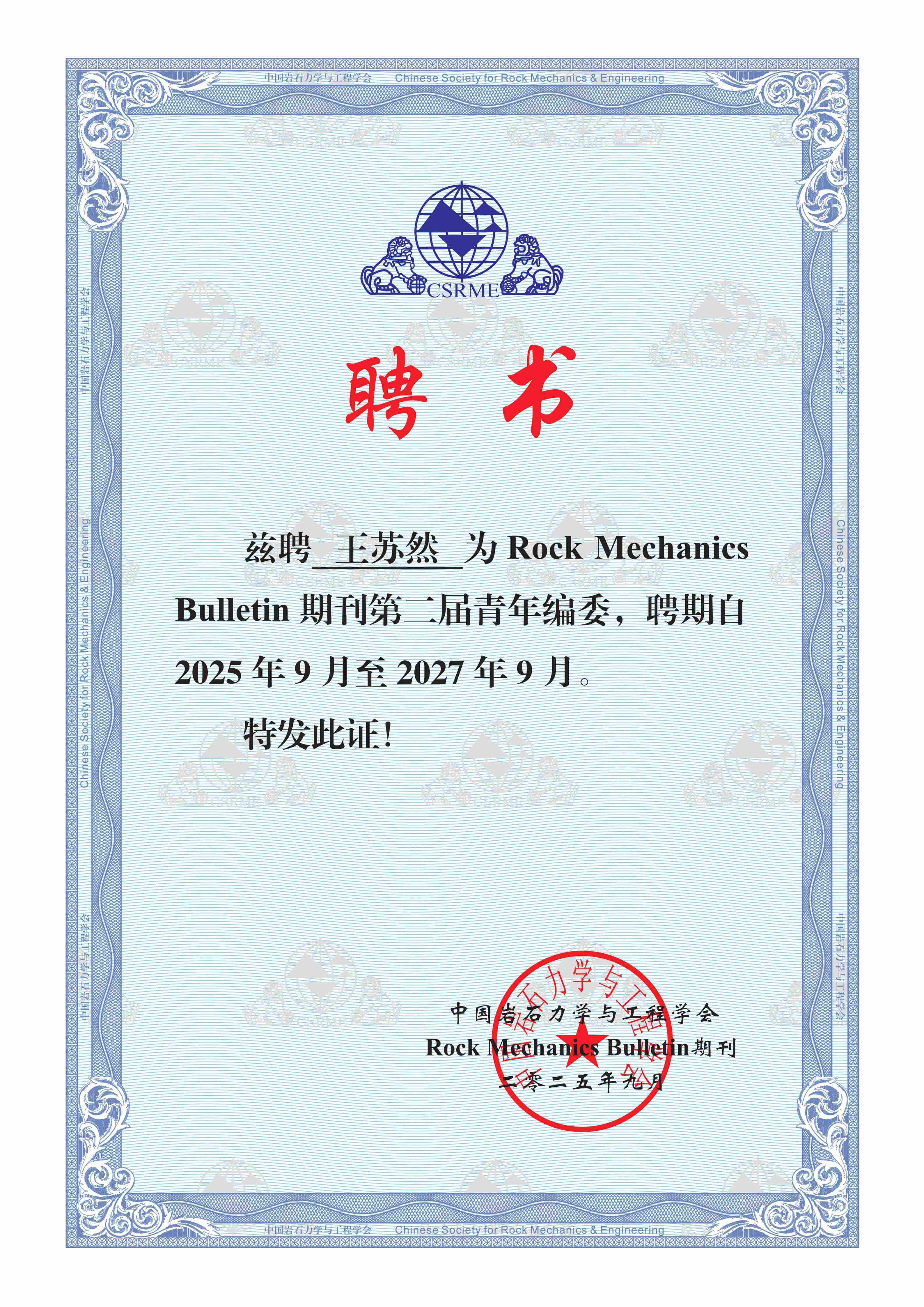 团队负责人王苏然博士续聘国际期刊Rock Mechanics Bulletin期刊首届青年编委,为期两年。Rock Mechanics Bulletin (《岩石力学通报(英文)》,简称RockMB)是由中国科协主管,中国岩石力学与工程学会与中国矿业大学(北京)主办的国际性、同行评审、开放获取的国产英文学术期刊。中国岩石力学与工程学会理事长何满潮院士与中国工程院外籍院士、美国国家工程院院士Derek Elsworth教授共同担任主编。2022年10月正式创刊,入选”中国科技期刊卓越行动计划高起点新刊项目”,已被ESCI、Scopus、DOAJ、CSCD、CNKI等国内外数据库收录。首个影响因子7.0,位于JCR Q1区 TOP。
